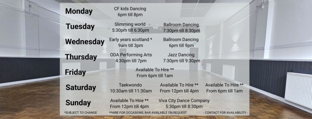 Multi purpose community hall based in Hillhead, Kirkintilloch. Please contact for more information including how to rent the hall, or see timetable for what’s on.
