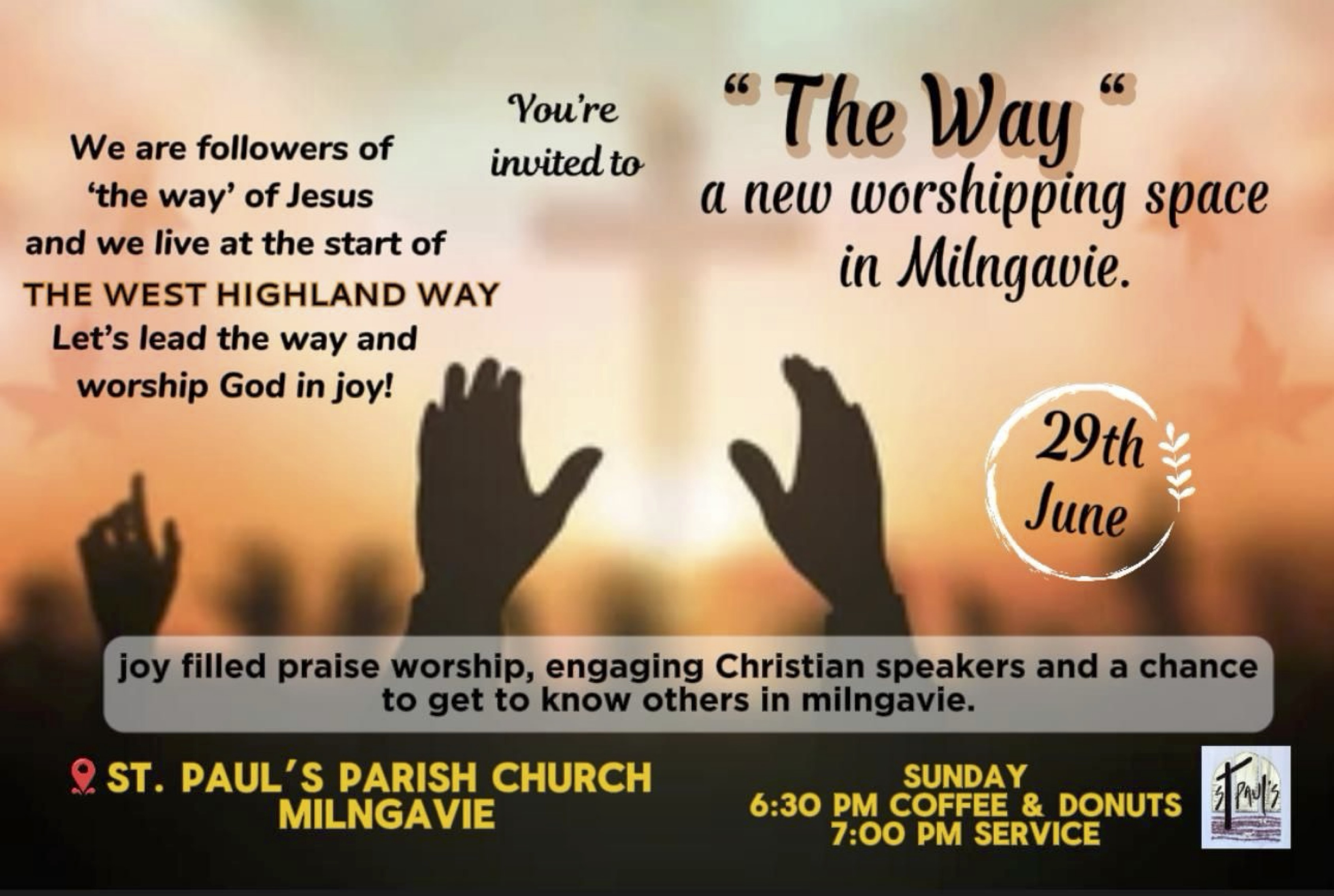 The Way – evening worship the last Sunday of every month, itโs a very relaxed time of Christian fellowship with praise band worship music.ย ย Donuts and Coffee are served from 6.30pm with the service starting at 7.00pm.